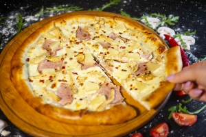 Піца на вершковій основі з моцарелою, куркою, ананасами та шинкою.