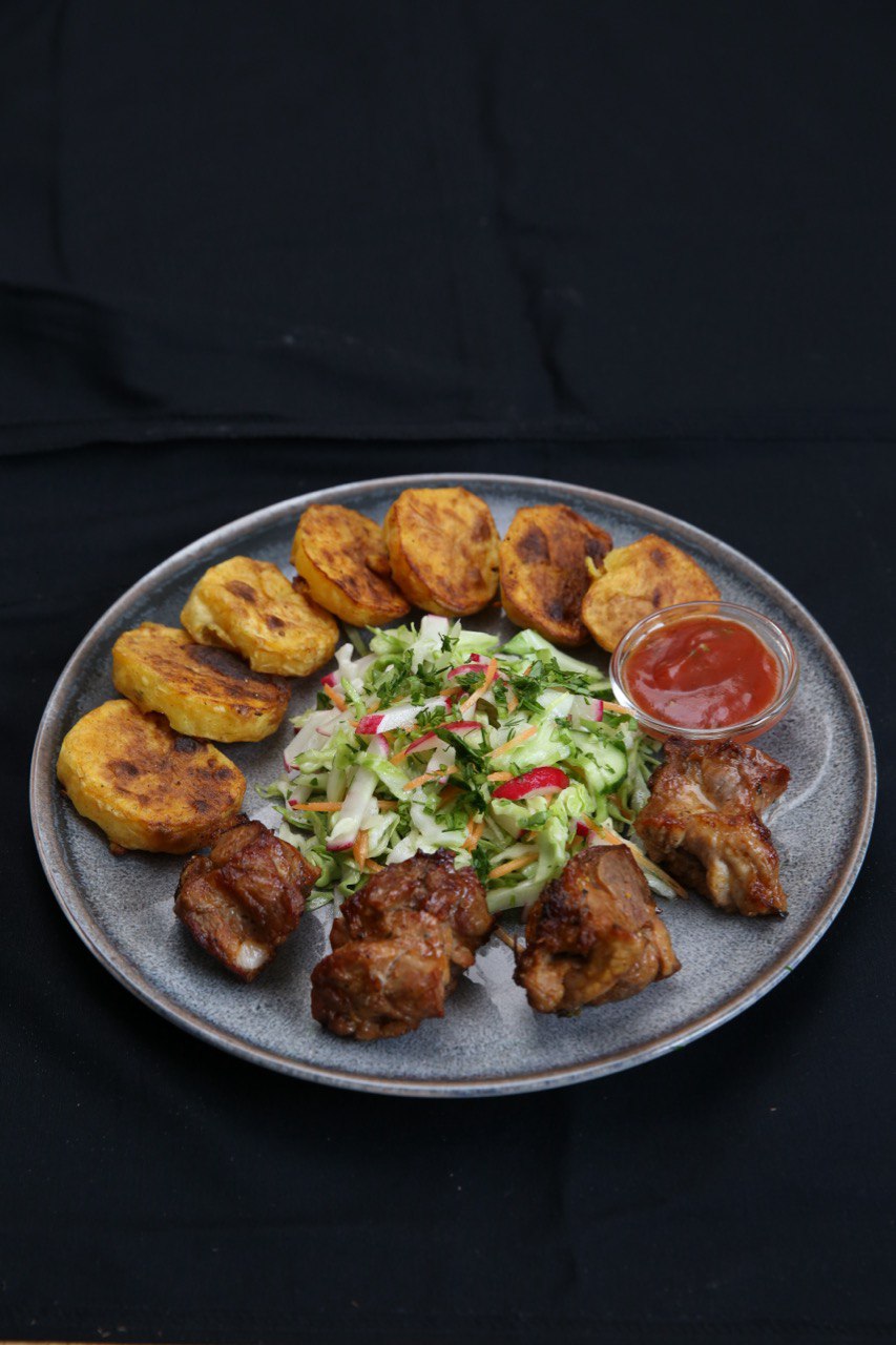Шашлык с свинины ошейка, салат капуста, картошка на мангале, соус томатный.