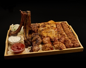шашлик з телятини, свинний стейк на кістці, люля-кебаб з телятини, баранина, шашлик з ошийка, червоний та білий соус.