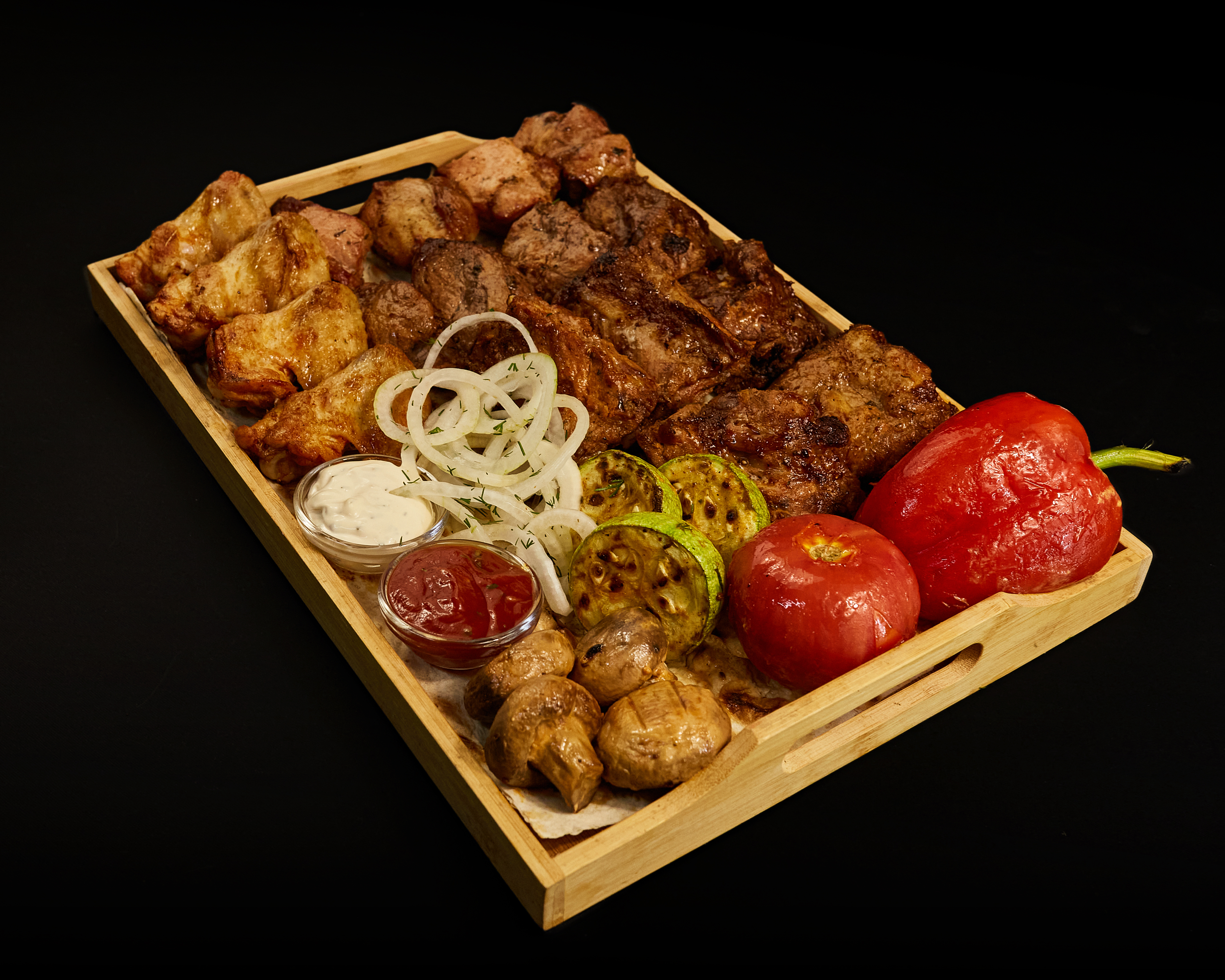 шашлик зі свинного ошийка, свинна вирізка, свинні ребра, курячі крильця, овочі гриль, червоний та білий соус.